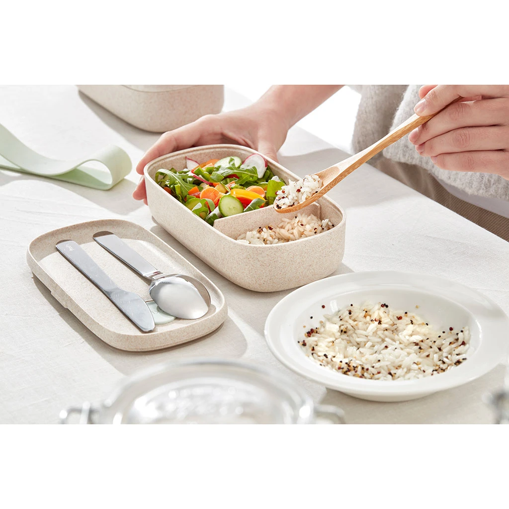 La lunch box inclut un sĂ©parateur qui permet de disposer diffĂ©rentes prĂ©parations dans le mĂŞme contenant. Cette nouvelle lunch box est fabriquĂ©e avec une moindre proportion de plastique grâce Ă l’utilisation d’un matĂ©riau organique.